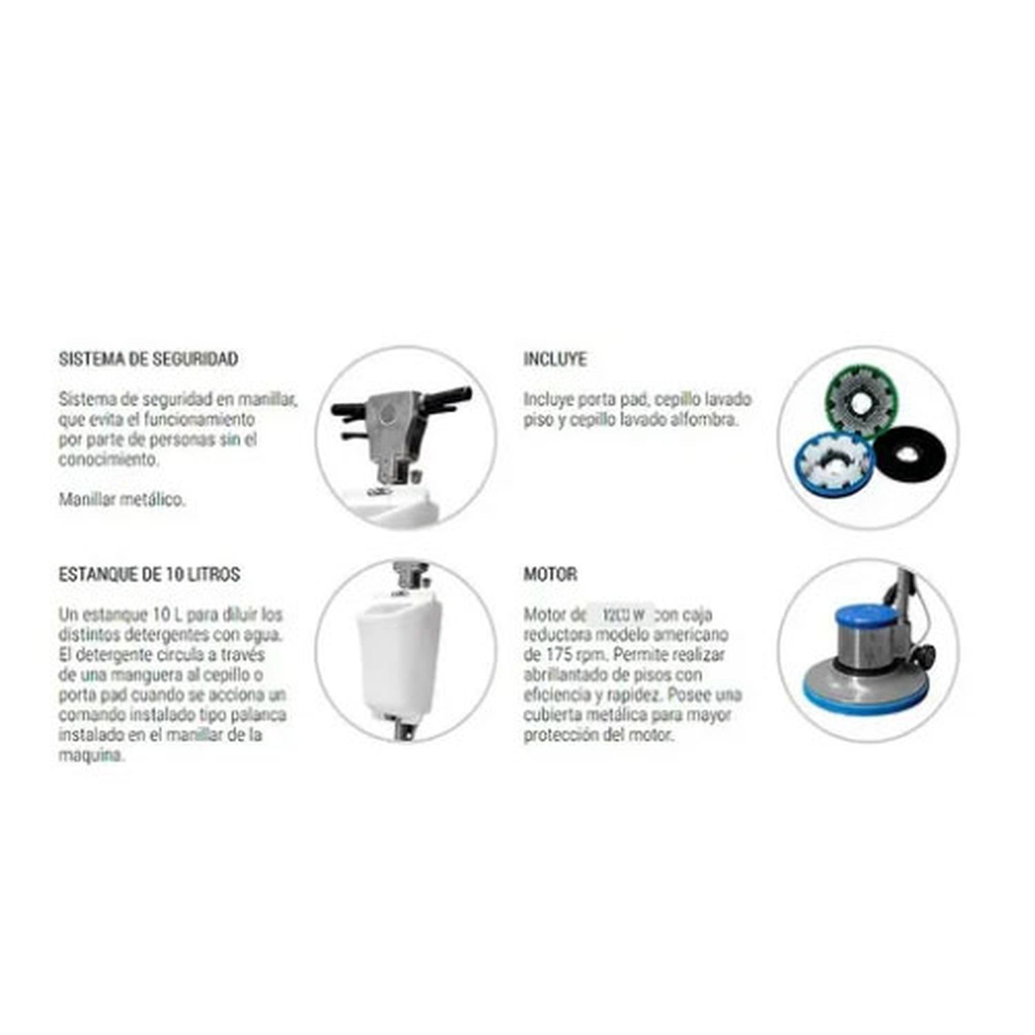 Máquina para Realizar lavado profesional de pisos y superficies, abrillantado de superficies con Aplicación de ceras y lavado de alfombra. Posee estanque para la utilización de DETERGENTES, cepillos para lavado de pisos y alfombra. Se porta EE.UU. con la almohadilla para limpieza y abrillantado de pisos y superficies.