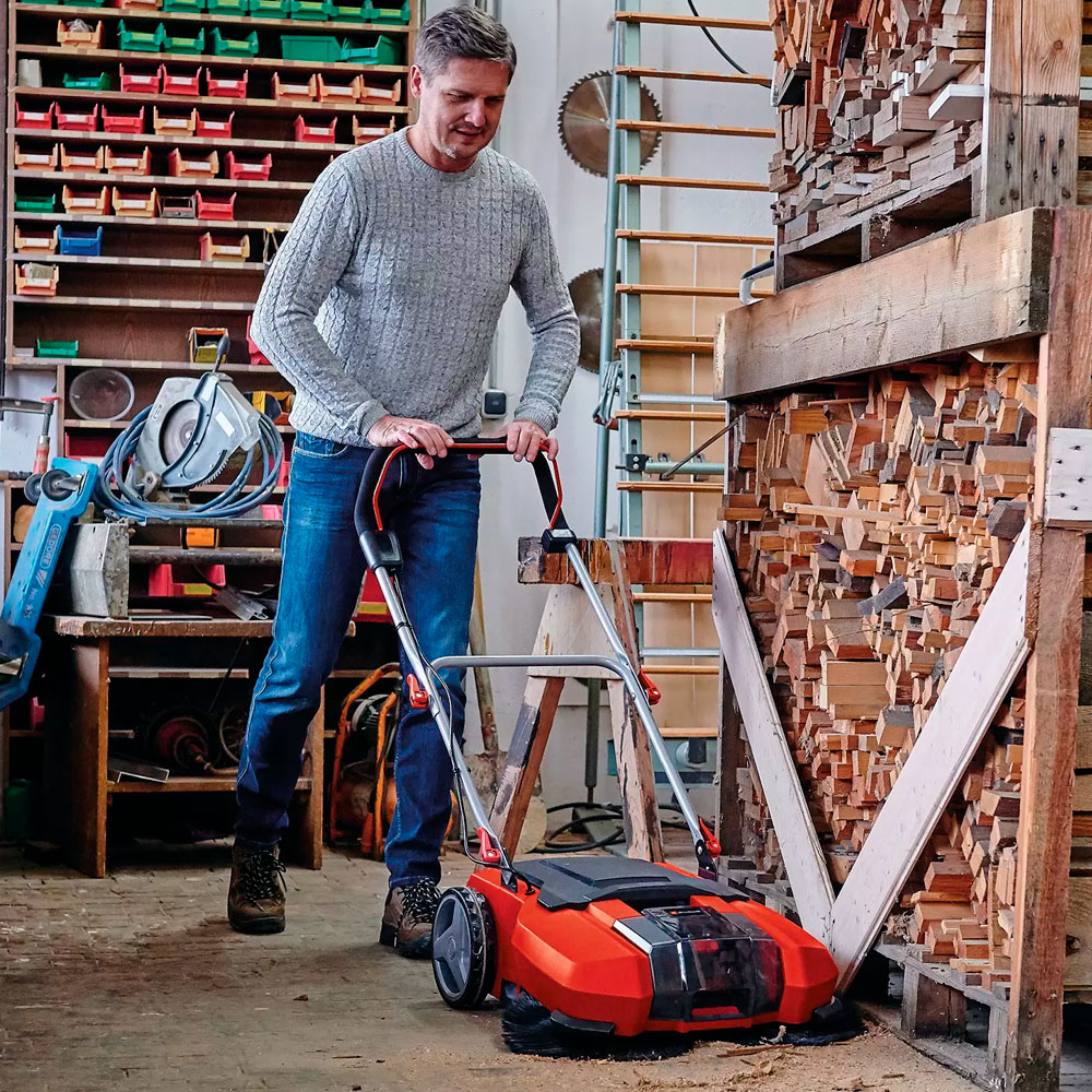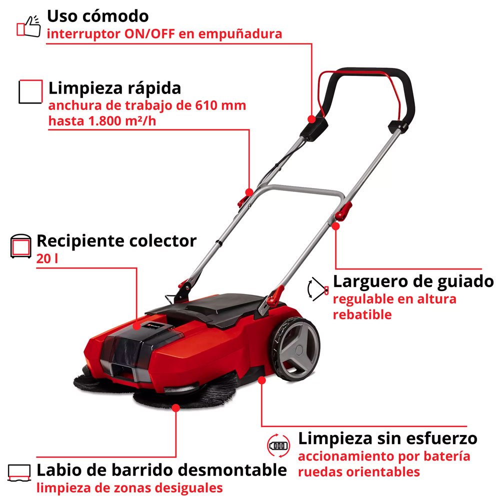 Como miembro de la familia Power X-Change, la barredora inalámbrica de Einhell TE-SW 18/610 Li-Solo es potente, fiable y flexible. Todas las baterías PXC de alta calidad de la serie se pueden combinar con cualquier equipo del sistema. La batería y el cargador se pueden adquirir por separado, por ejemplo, en forma de un práctico set para principiantes. La barredora necesita una batería de 18 voltios para su funcionamiento. Barrer la entrada o el camino peatonal puede ser difícil, pero no debe. La barredora ayuda en la limpieza para un barrido sin esfuerzo ni trabajo con accionamiento y motor asistidos por batería. Especialmente la limpieza de gran superficie de hasta 1800 m² por hora gracias al ancho de barrido de 610 mm hace que sea fácil mantener limpios grandes patios. Con la barredora inalámbrica se pueden alcanzar todas las esquinas, con escobas posicionadas lateralmente. El labio se puede desmontar para barrer zonas muy desiguales. El interruptor de encendido y apagado se sitúa directamente en el empuñadura, muy fácil de alcanzar. Las ruedecillas dirigibles proporcionan un manejo sencillo sobre todas las superficies. La barredora con batería es cómoda de transportar gracias a la forma ergonómica y las grandes ruedas. La barredora con batería dispone de una superficie de colocación y un manillar regulable para guardarla de forma sencilla. El envío incluye un contenedor de suciedad de 20 litros de alta calidad y seguro de colocar. La batería PXC y el cargador no están incluidos en el alcance del envío.