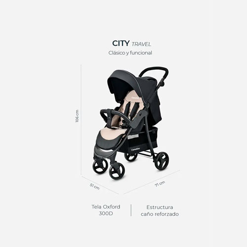 La estructura de caño reforzado del coche CITY TRAVEL lo hace estable, fuerte y seguro, permitiéndole soportar un peso de hasta 20 kg. El manillar se ajusta en varias posiciones de altura para proporcionar la comodidad adecuada al usuario que lleve el coche.