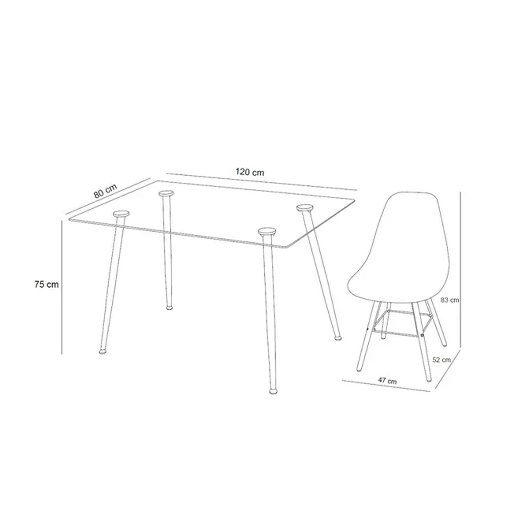 Este Juego de comedor es ideal para departamentos, cocinas o comedores con espacio limitado. La mesa, con dimensiones de 75 x 120 x 80 cm, y las sillas, de 83 x 47 x 52 cm, están diseñadas para acomodar cómodamente a cuatro personas. Además, cada silla soporta hasta 100 kg, lo que asegura estabilidad y seguridad durante su uso.