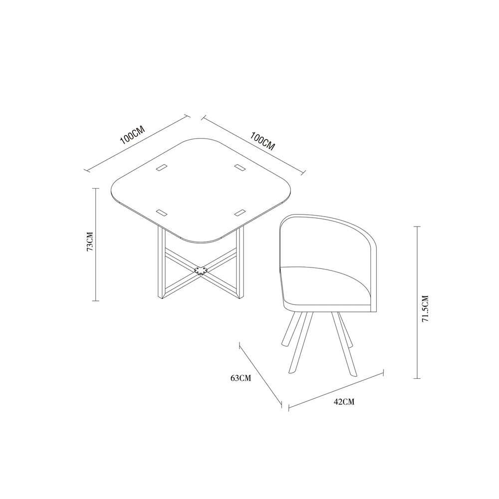Medidas Mesa: 73 x 100 x 100 cm. Silla: 70,5 x 53 x 63 cm