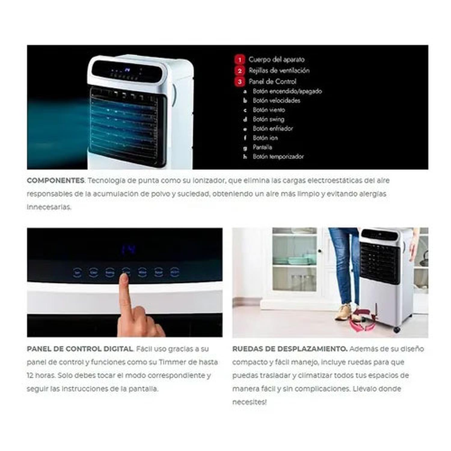 Disfruta este enfriador y humificador 2 en 1 con una potencia de 80 watts (refrigeración) y una capacidad del depósito de agua 10 lts, que te permitirá operarlo por más tiempo sin tener que recargarlo, asi como ser extraido para una fácil limpieza. Además podrás trasladarlo por donde quieras con sus ruedas.