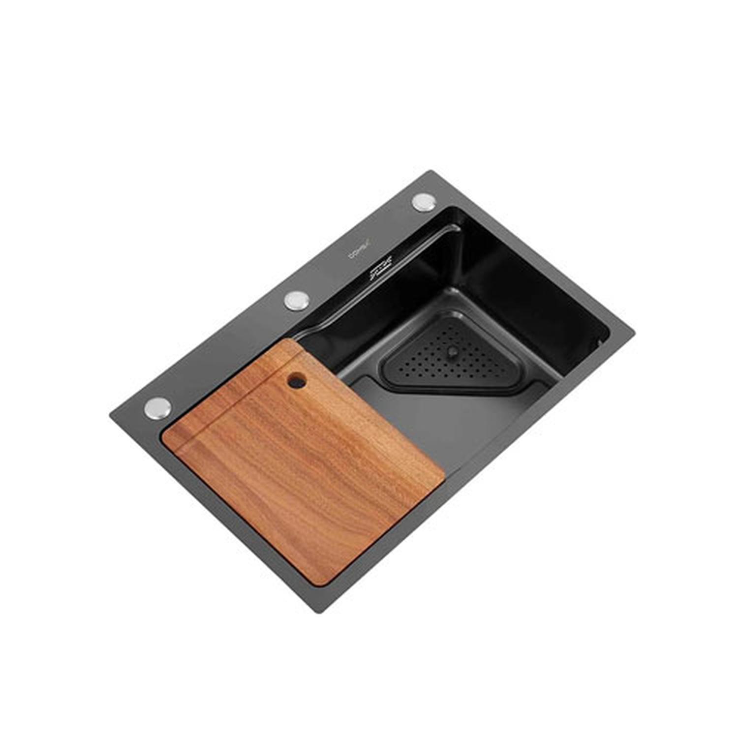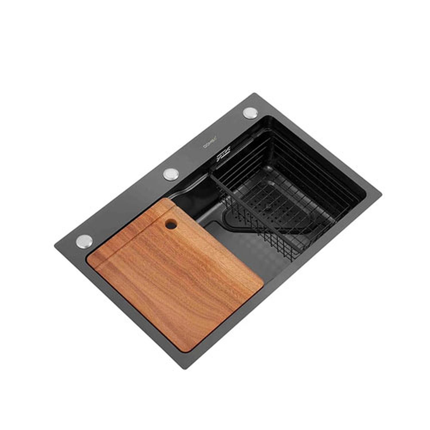 Accesorios Incluidos: Dispensador de Jabón, Tabla para cortar de Madera (Roble), Canasto, Cesta con drenaje de acero inoxidable, Desagüe y Sifón.