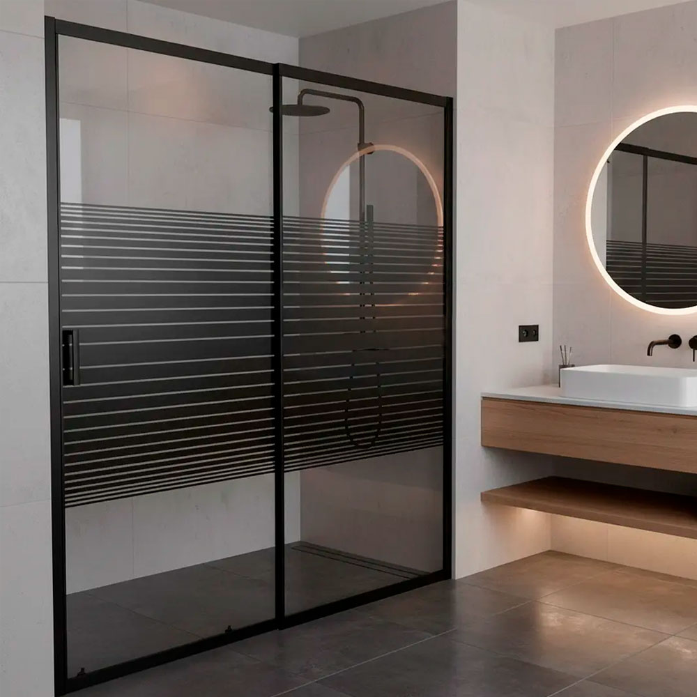 La mampara de ducha Ajustable (140-160 cm × 185 cm) fusiona versatilidad y diseño. Su vidrio templado de 6 mm incorpora un patrón de líneas horizontales negras que brinda privacidad parcial sin restar luminosidad. Gracias a su sistema de puertas correderas, disfruta de un acceso cómodo y un deslizamiento suave en cualquier baño.