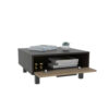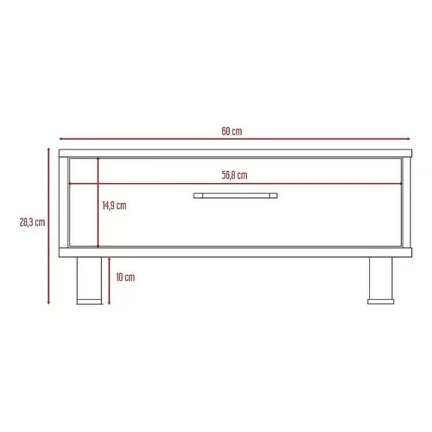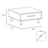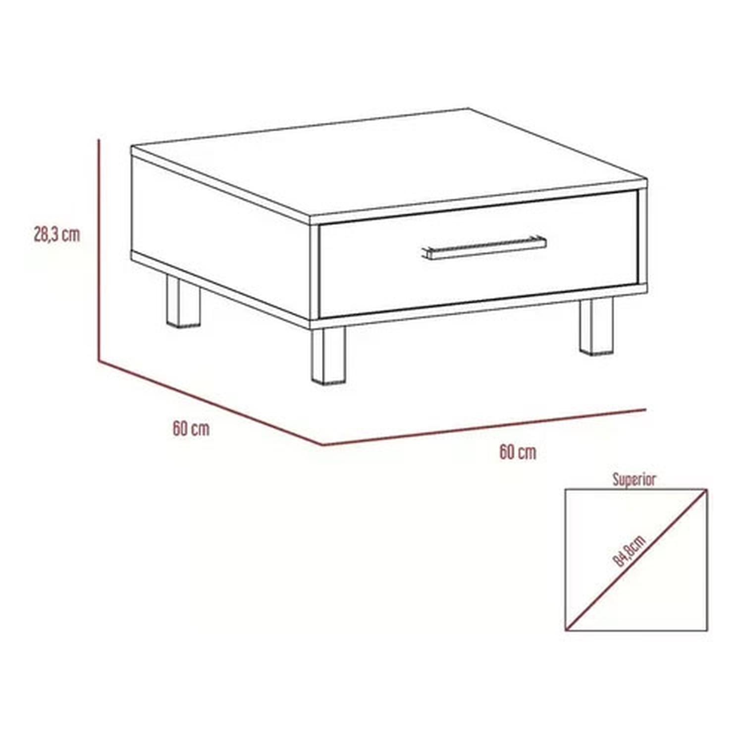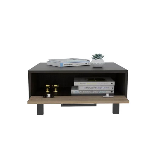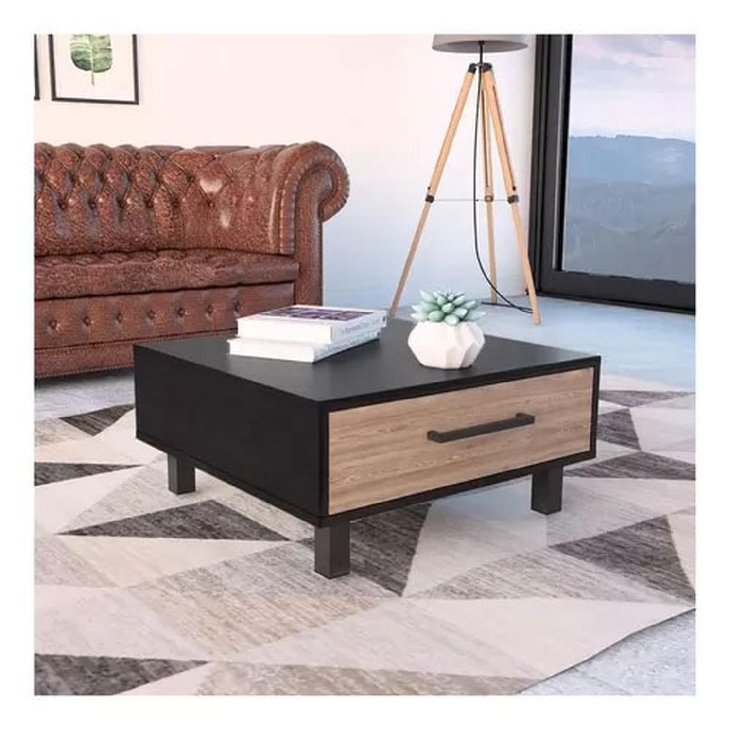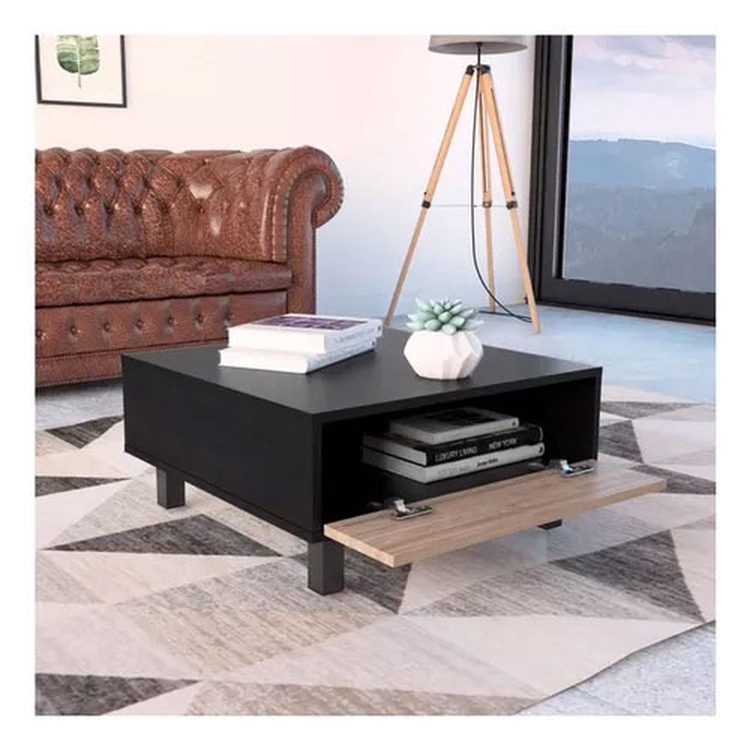 Mesa de centro, con un cajón deslizable, varios entrepaños para colocar objetos y patas de acero.