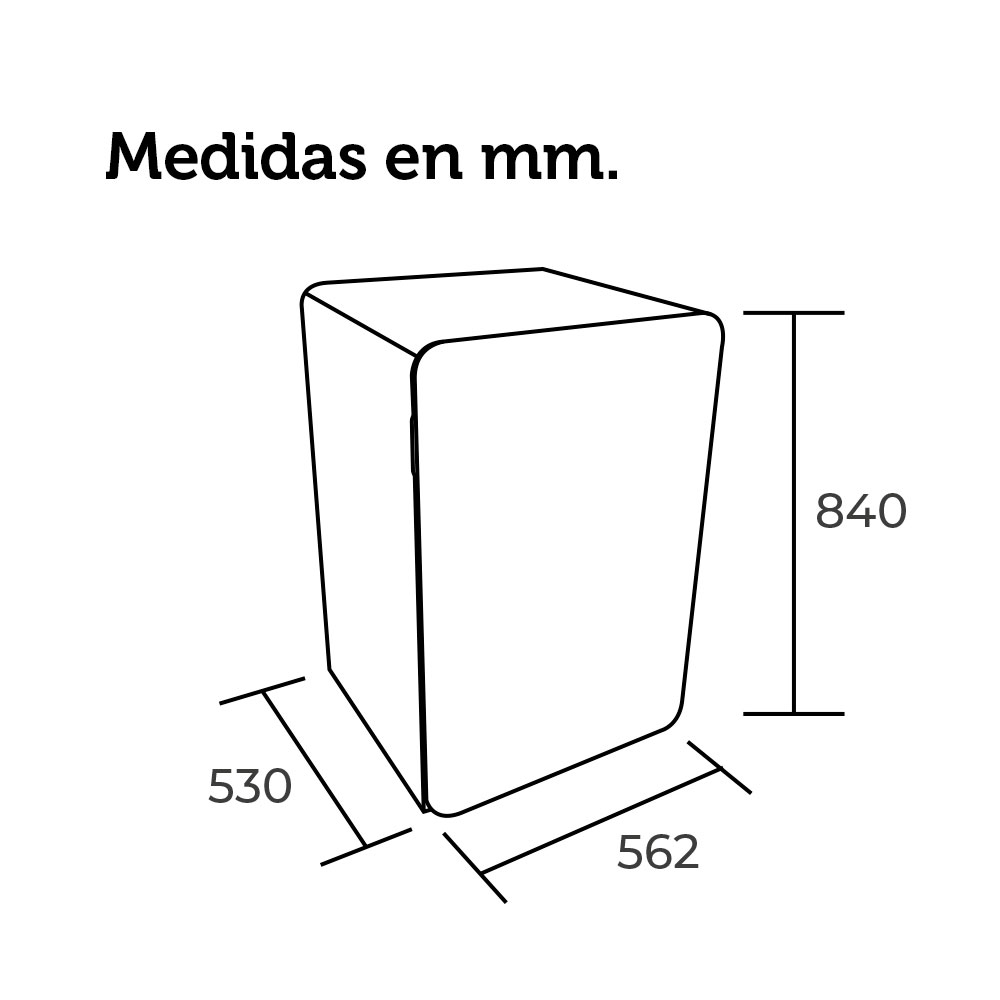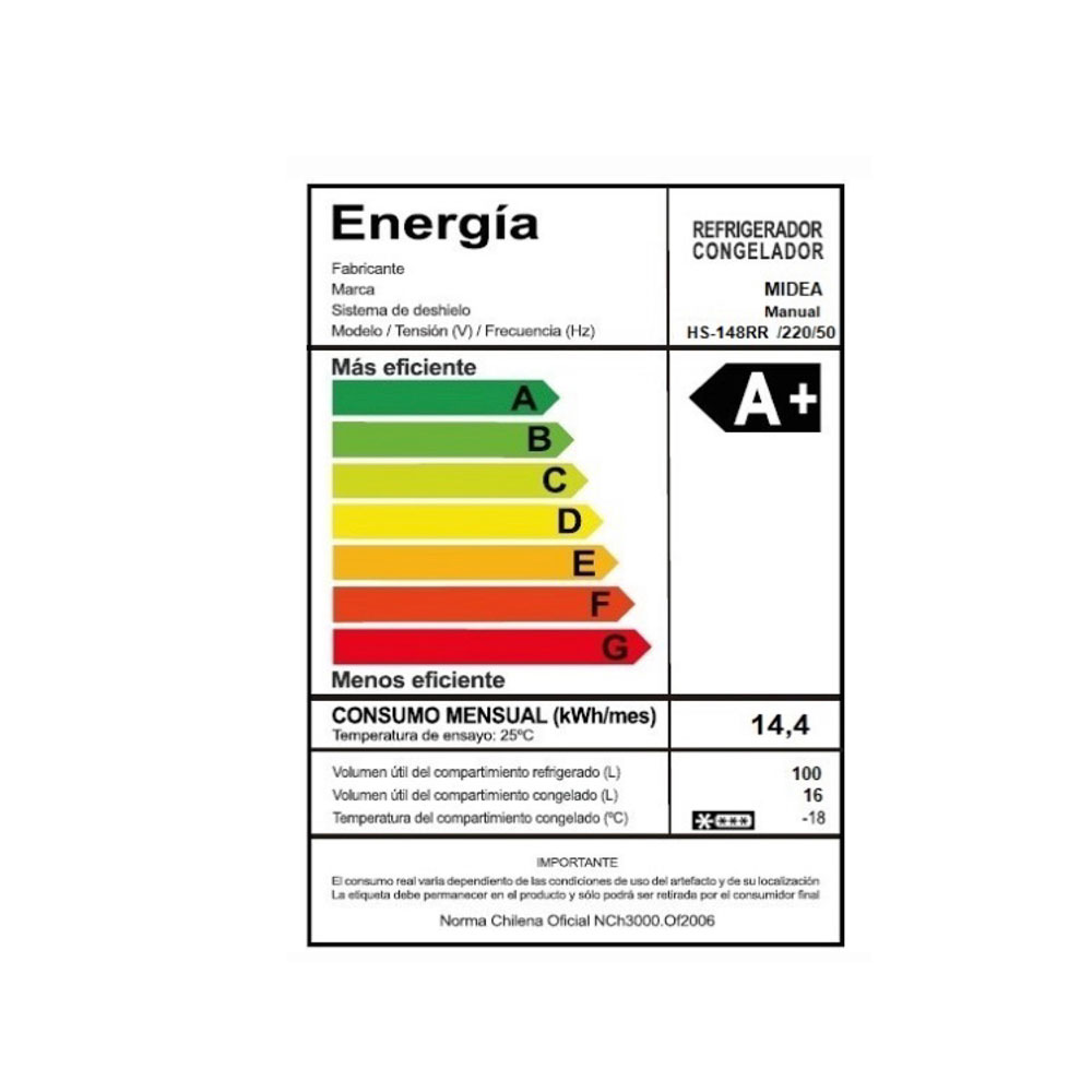 Especificaciones Técnicas Volumen bruto total (Lts.) 116 Potencia (W) 70 Voltaje de potencia (V) 220 Frecuencia nominal (Hz) 50 Temperatura Refrigeración (ºC) 0 a 10 Temperatura freezer (ºC) 0 a -18 Consumo de energía 0,48kWh/24h Corriente nominal (A) 0,6 Refrigerante R600, 32 grs. Clase climática ST Dimensiones Producto (mm) 562x530x840 Embalaje (mm) 580x568x880 Peso neto (kg) 25,1