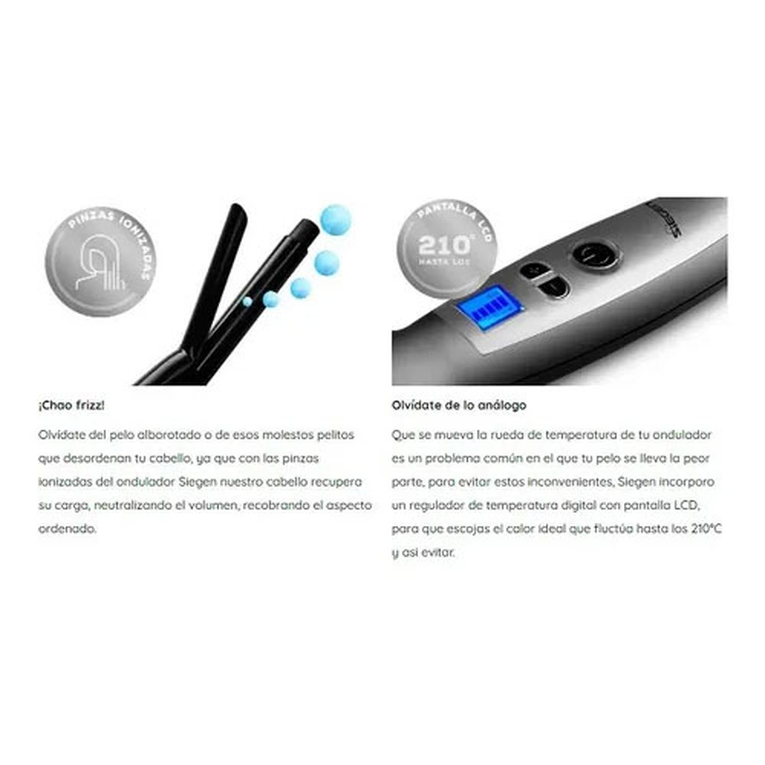 Olvídate del pelo alborotado o de esos molestos pelitos que desordenan tu cabello, ya que con las pinzas ionizadas del ondulador Siegen nuestro cabello recupera su carga, neutralizando el volumen, recobrando el aspecto ordenado.