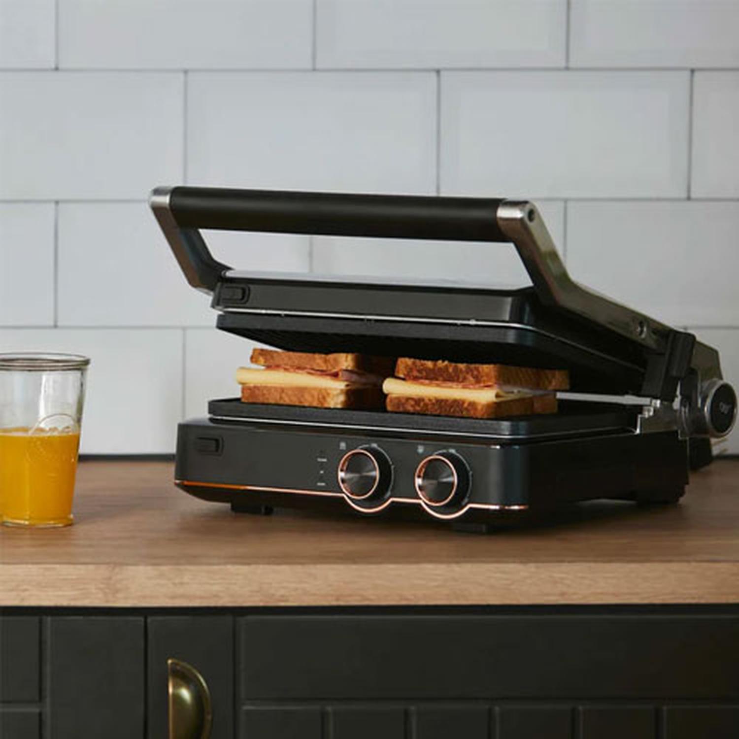 Este Grill Panini como lo dice su nombre cuenta con una doble función ya que puedes utilizarlo como parrilla extendiéndolo hasta 180º o como plancha regulando su altura a gusto. Cuenta con 2 placas antiadherentes y desmontables para una fácil limpieza. Además puedes regular la temperatura de manera independiente para cada placa.