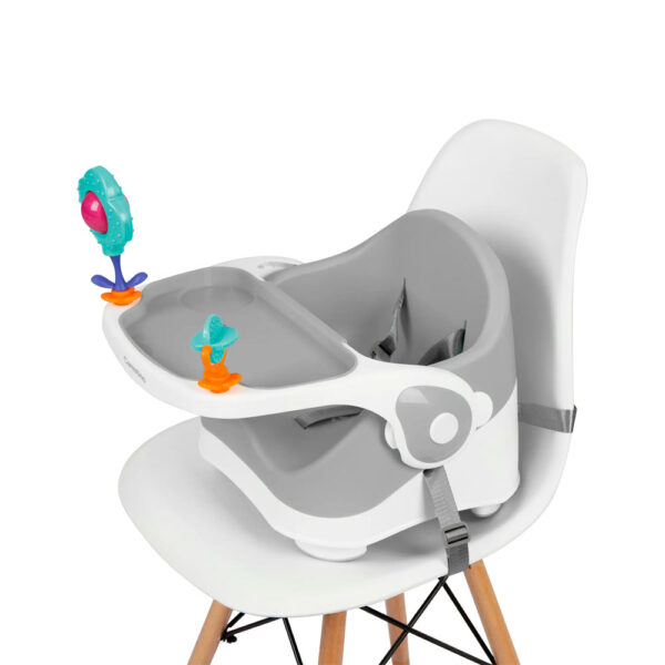 La silla BOOSTER ofrece tres posiciones de altura ajustable, adaptándose perfectamente a diferentes mesas y superficies. Con una capacidad de carga de hasta 18 kg, sus pies antideslizantes brindan estabilidad y seguridad durante las comidas y en los momentos de juego.