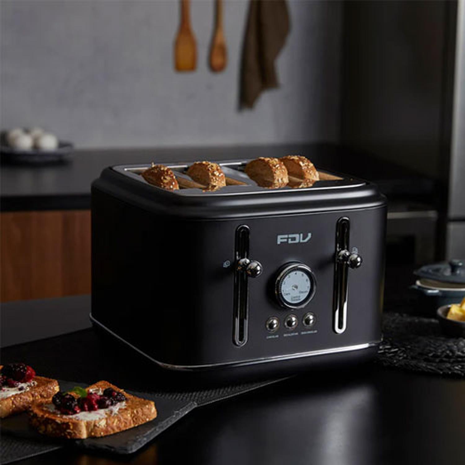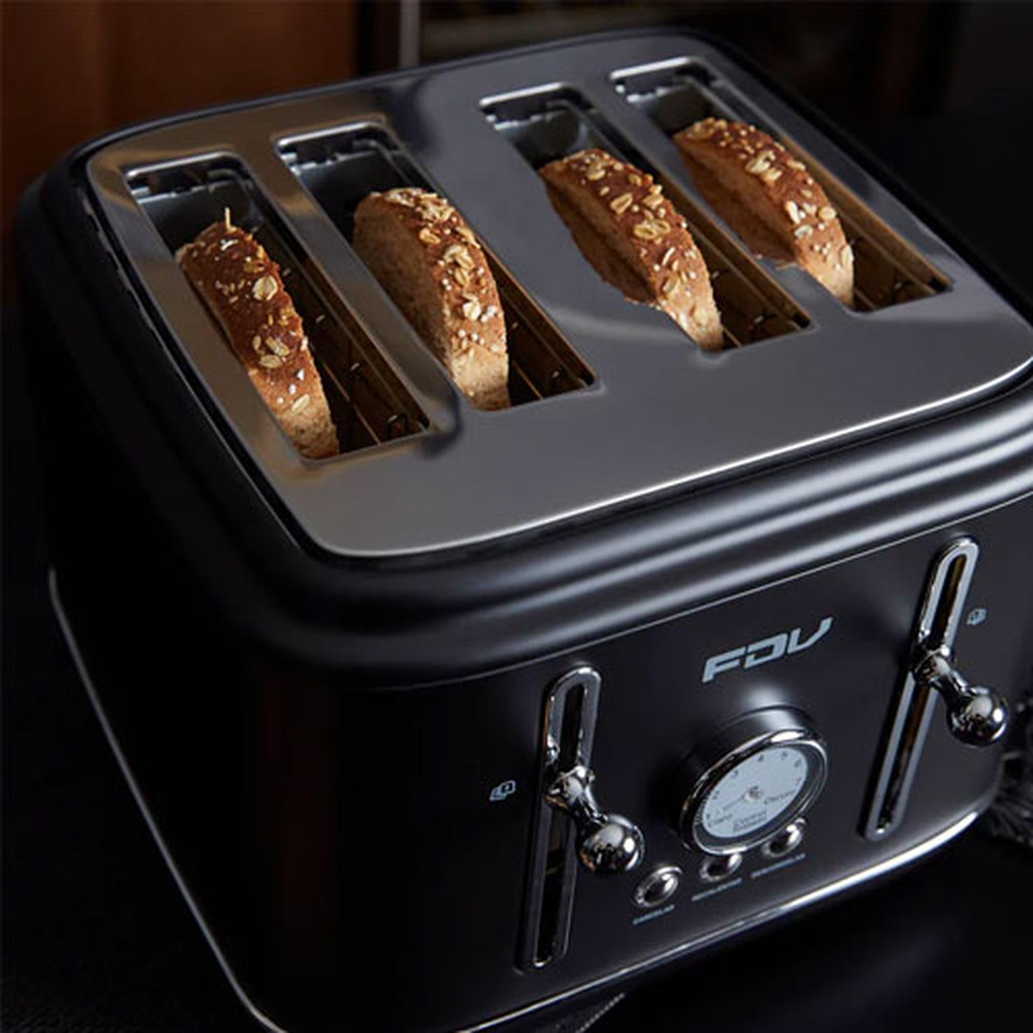 Modernidad y estilo con el nuevo tostador 4 rebanadas Iconic Black de FDV. Con cuerpo de acero inoxidable, su diseño en negro mate con termostato análogo le dará un toque diferente a tu cocina.