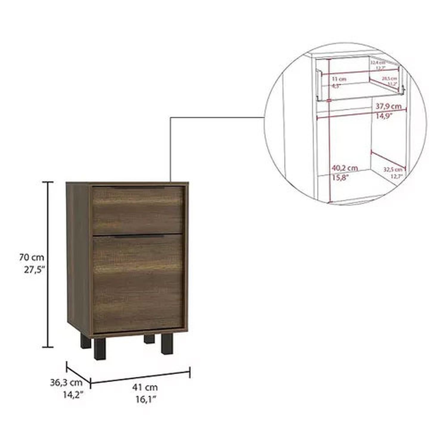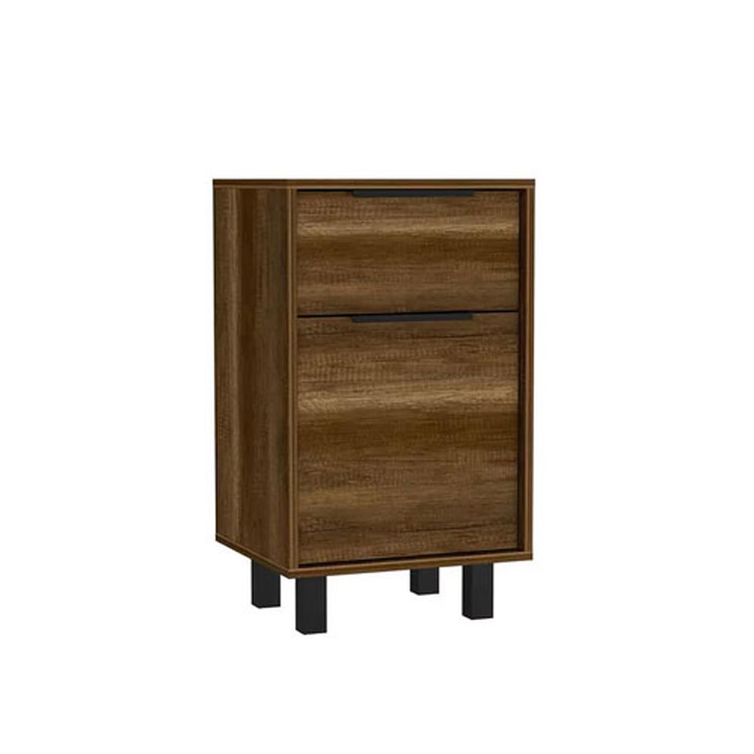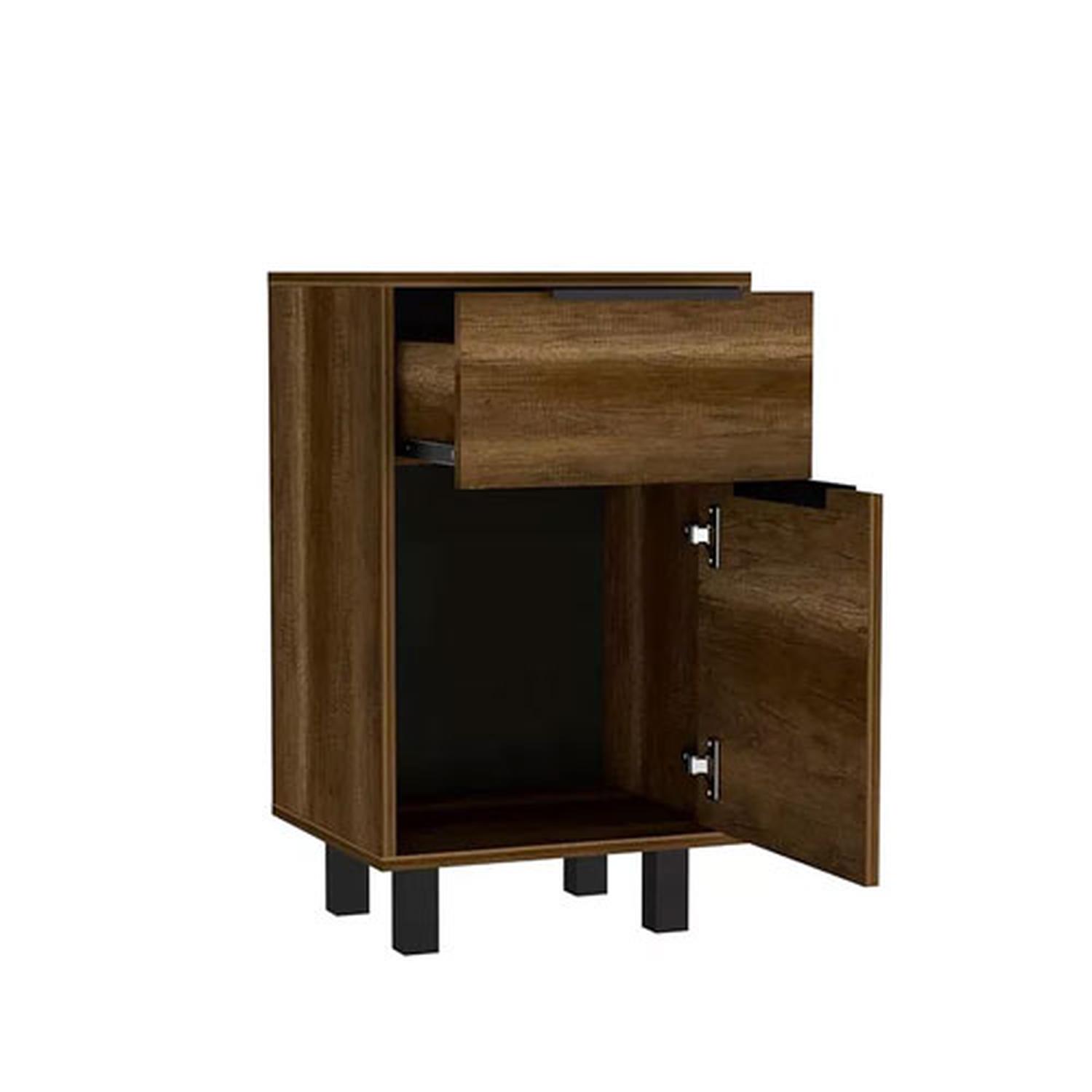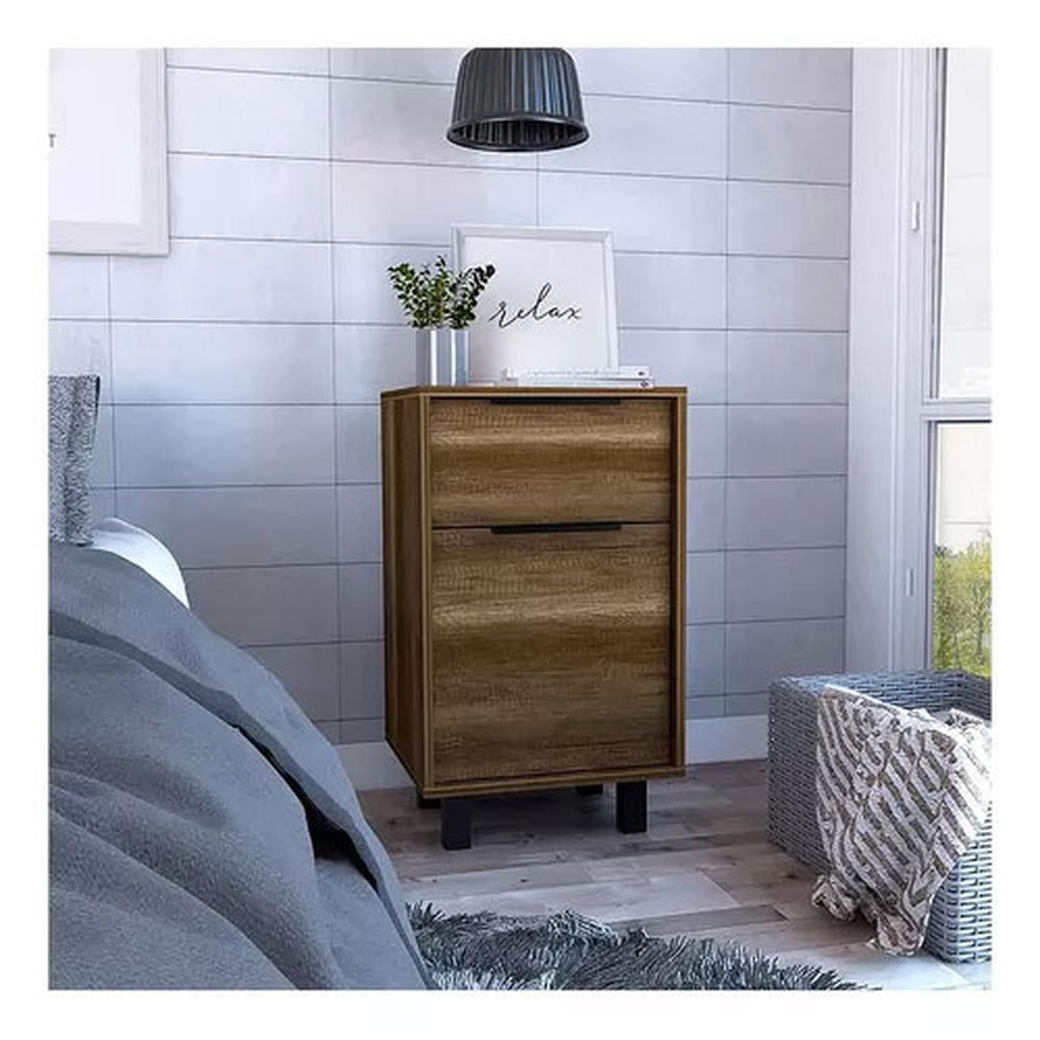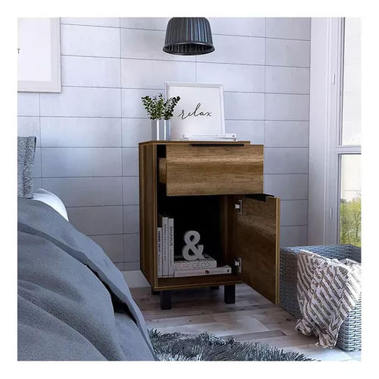 Velador Kaia Z, Caramelo y Wengue, con una puerta batiente y un cajón organizador