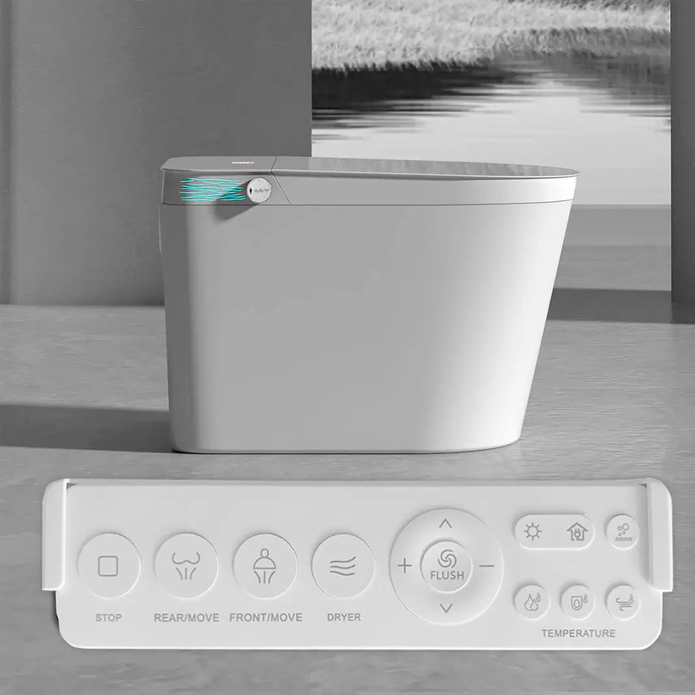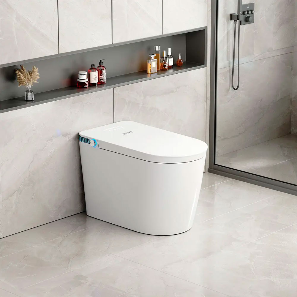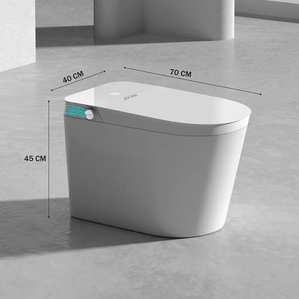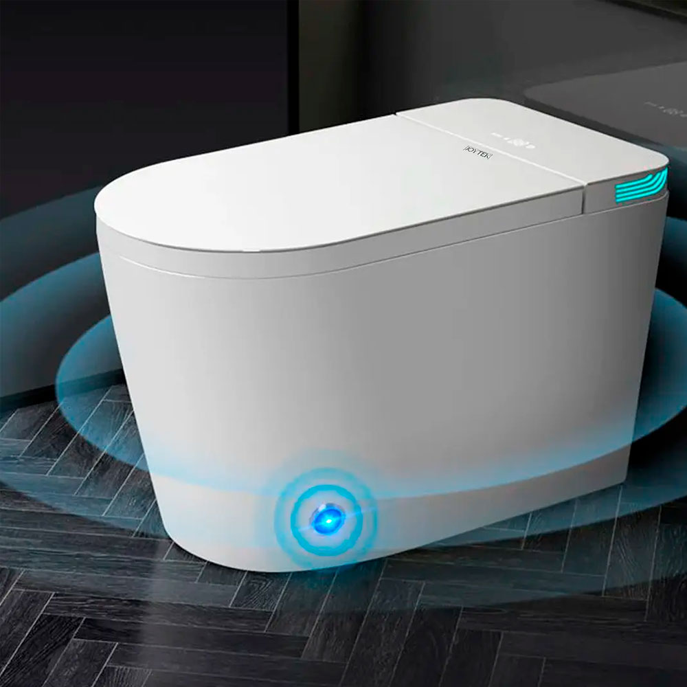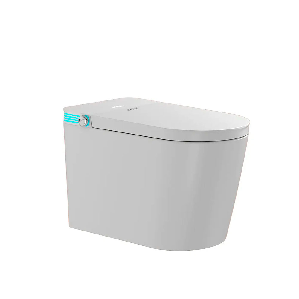 Diseñado con un estilo moderno y minimalista, este inodoro eléctrico de color blanco está fabricado en loza/cerámica esmaltada de acabado brillante, ofreciendo durabilidad, fácil limpieza y un aspecto sofisticado.