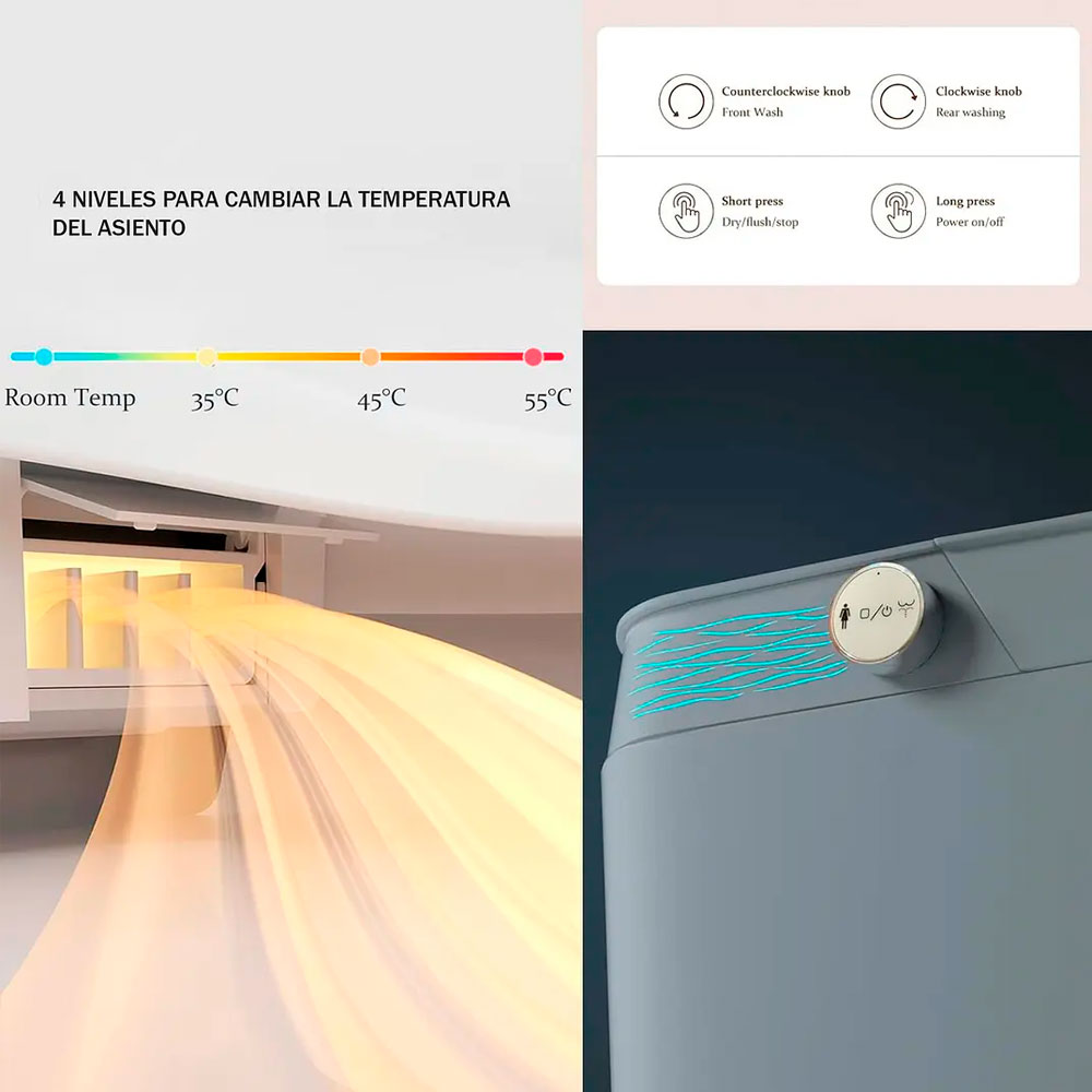 Vive una experiencia de uso superior con su asiento, agua y aire calefaccionados, regulables en 4 niveles de temperatura, ideales para adaptarse a tus preferencias en cualquier estación. La función bidé proporciona un lavado suave e higiénico, con presión de agua ajustable para una limpieza personalizada.
